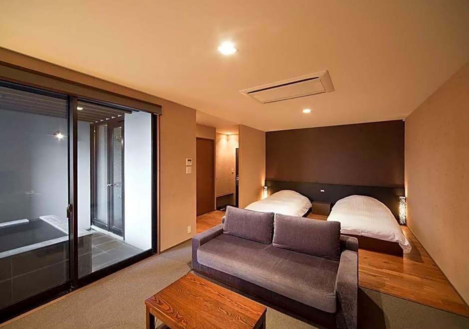 Spacious room featuring wooden flooring, comfortable twin beds and a carpeted living area. It comes with a private open-air hot spring bath, an LCD TV and free Wi-Fi.